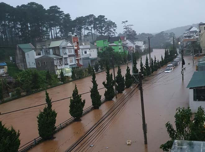 Mưa lớn làm ngập đường ở Đà Lạt.
