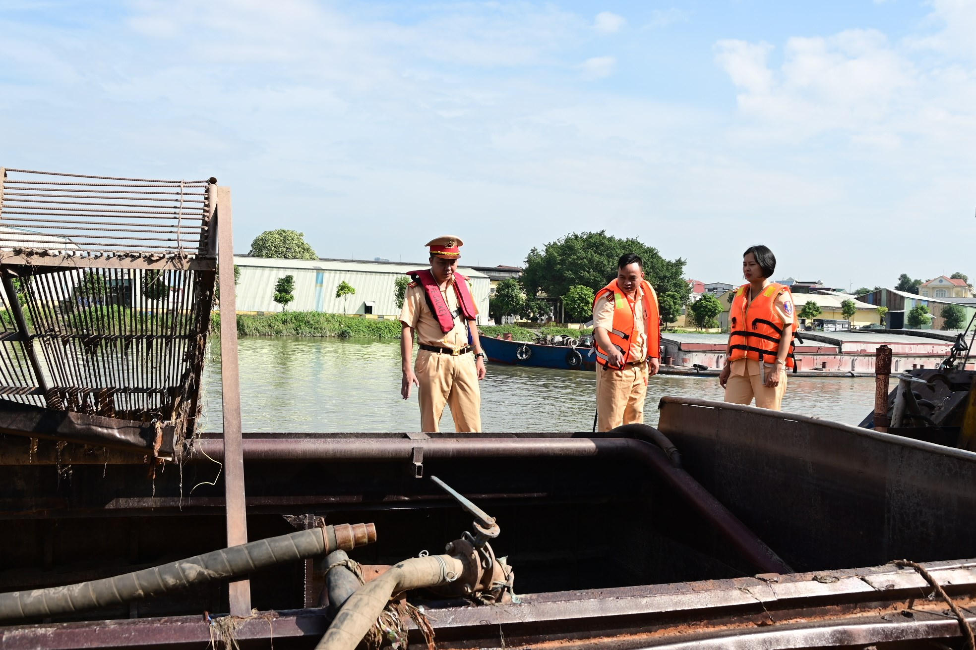 Lực Cảnh sát giao thông bắt giữ tàu chở cát không hóa đơn chứng từ. Ảnh: Công an Hải Phòng