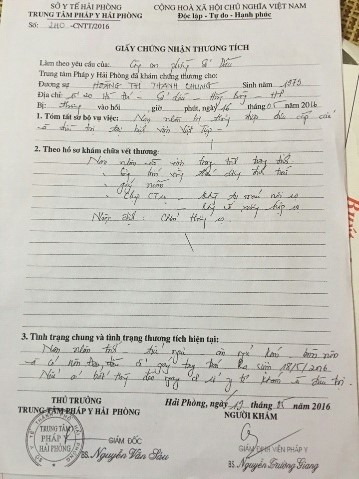 Cũng trong buổi tiếp xúc với PV, chị Chung đã đưa cho PV giấy chứng nhận thương tích được trung tâm pháp y Hải Phòng xác nhận ngay sau vài ngày chị Chung phải nhập viện điều trị vì bị đánh vào đầu.