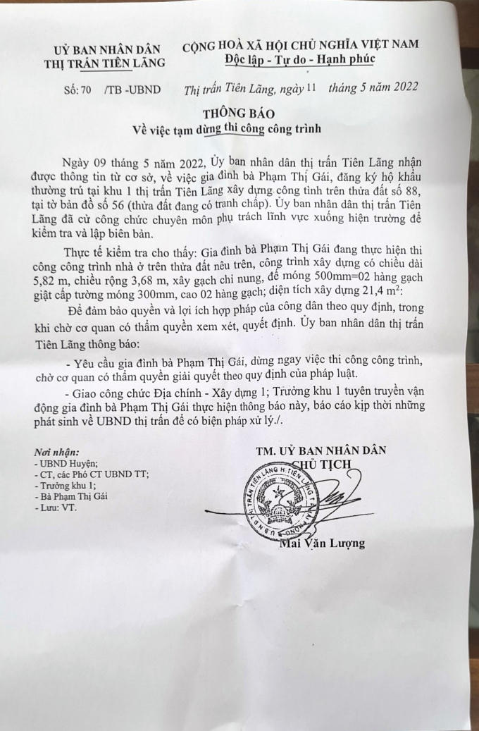 Ngày 11/5, 2 ngày sau khi lập biên bản, UBND Thị trấn huyện Tiên Lãng tiếp tục ban hành thông báo số 70/TB-UBND về việc tạm dừng thi công đối với gia đình cụ Gái. Thực tế kiểm tra cho thấy: Gia đình cụ Gái đang thực hiện thi công công trình nhà ở khoảng 21m2 bằng gạch chỉ nung trên thửa đất nêu trên.