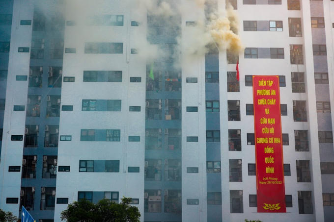 Tình huống giả định xảy ra cháy tại tầng 8 của chung cư, do sự cố rò rỉ khí gas gặp tia lửa điện gây ra cháy nổ. Tại thời điểm xảy ra cháy, có khoảng 600 người dân đang ở trong tòa nhà. Khi nghe thấy báo cháy, mọi người hoảng loạn tìm cách thoát ra ngoài. Có 32 người bị thương và bị mắc kẹt trong toà nhà.
