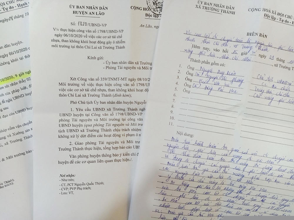Công văn chỉ đạo của UBND huyện An Lão và biên bản làm việc giữa chủ xưởng phế liệu vi phạm và chính quyền.