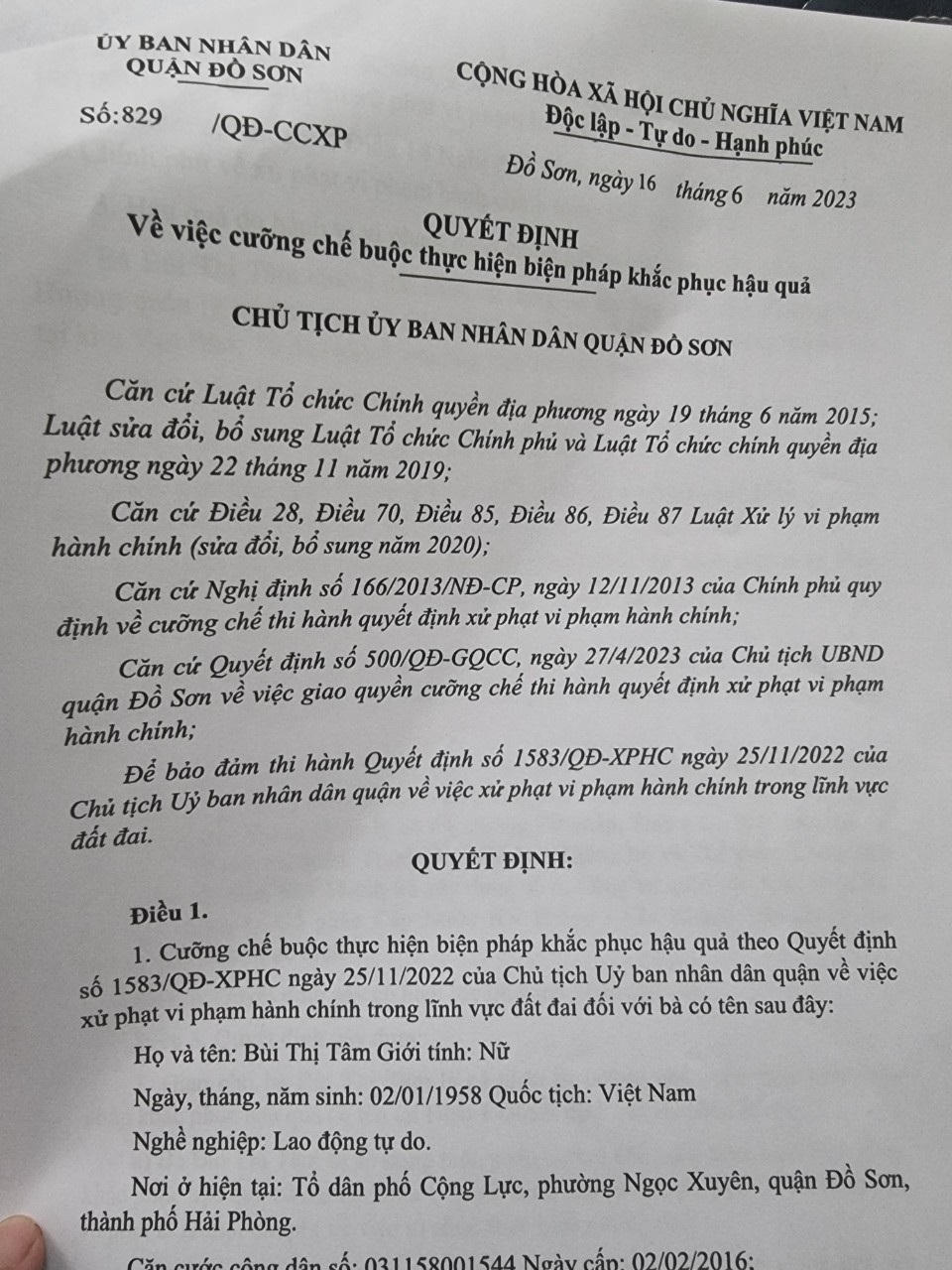 Ngày 16/06/2023, UBND quận Đồ Sơn đã ban hành Quyết định cưỡng chế buộc thực hiện biện pháp khắc phục hậu quả với việc sửa dụng đất của hộ gia đình bà Tâm, ông Hồng. Theo đó, Quyết định cưỡng chế buộc thực hiện biện pháp khắc phục hậu quả theo Quyết định số 1583/QDD-XPHC ngày 25/11/2022 của Chủ tịch UBND quận về việc xử phạt vi phạm hành chính trong lĩnh vực đất đai đối với hộ gia đình ông bà Tâm - Hồng.