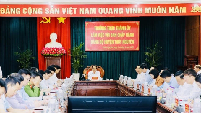 Ngày 16/3, Ủy viên Trung ương Đảng, Bí thư Thành ủy, Chủ tịch HĐND TP Lê Văn Thành làm việc với Ban Thường vụ huyện Thủy Nguyên về tình hình thực hiện nhiệm vụ phát triển kinh tế - xã hội từ đầu nhiệm kỳ Đại hội XXV Đảng bộ huyện đến nay; tiến độ triển khai các công trình, dự án trọng điểm và kết quả xây dựng xã nông thôn mới kiểu mẫu trên địa bàn huyện; việc triển khai đề án thành lập TP Thủy Nguyên thuộc TP Hải Phòng.