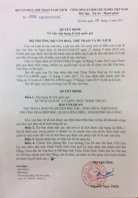 Chiều 15/4, ông Phan Thanh Hải, Giám đốc Trung tâm Bảo tồn di tích Cố đô Huế cho biết Bộ Văn hóa - Thể thao và Du lịch vừa ký quyết định xếp hạng Di tích cấp Quốc gia đối với Hải Vân Quan.