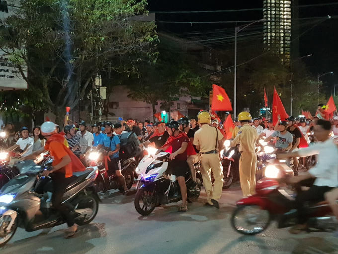 Ngay sau khi đội tuyển U 23 Việt Nam chiến thắng, Công an thành phố Huế đã triển khai tất cả lực lượng, chốt chặn tại các ngả đường, hướng dẫn người dân cổ vũ đi trong trật tự.