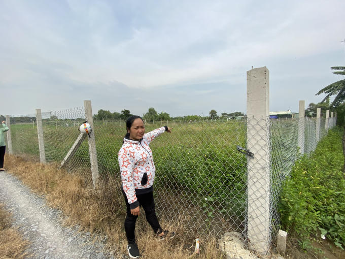 Bà Ngô Thị Tuyết đang đứng trước mảnh đất nông nghiệp phân lô, hiện tại đã được chủ đất mới rào lại.