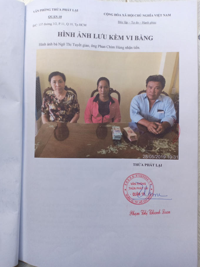 Theo hồ sơ chúng tôi có được, các vi bằng do Văn phòng Thừa phát lại huyện Hóc Môn và Văn phòng Thừa phát lại quận 10 thực hiện. Nội dung đều ghi nhận việc ông Tuấn và ông Hùng nhận tiền, kèm theo hình ảnh và văn bản thỏa thuận chuyển nhượng đất có chữ ký và dấu lăn tay của hai bên mua bán.