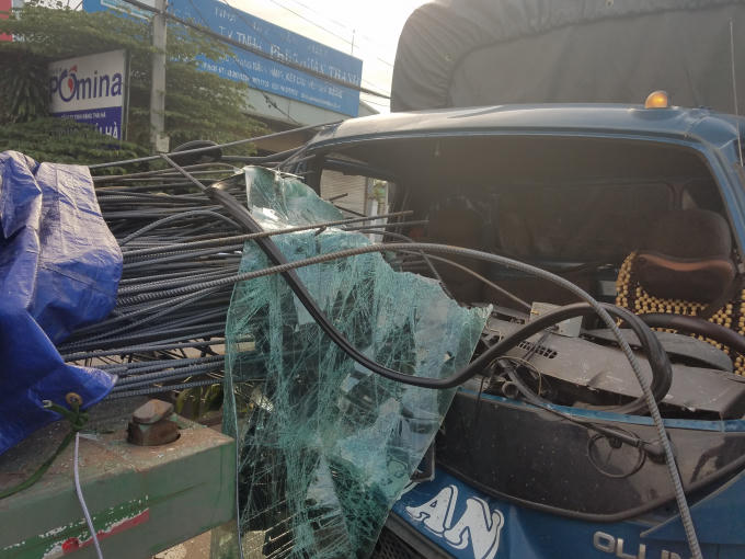 Va chạm làm cho hàng chục thanh sắt trên xe đầu kéo xuyên thủng cabin xe tải, hai phụ xe bị sắt đâm trúng phải nhập viện cấp cứu, nam tài xế bị thương nhẹ. Kính chắn gió xe tải bể nát.