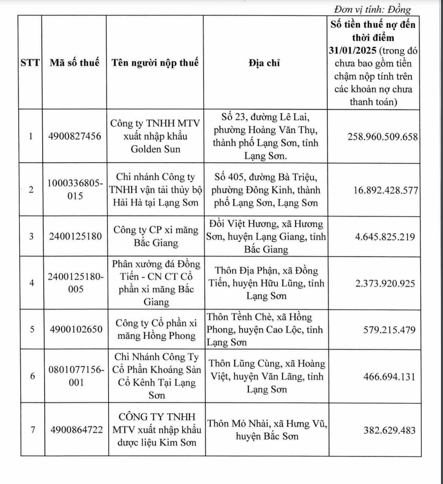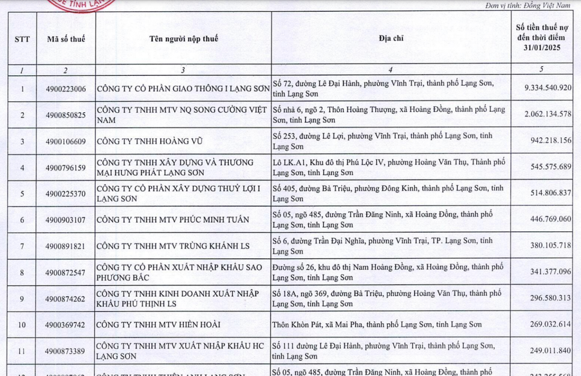 Cục Thuế tỉnh Lạng Sơn và Chi cục Thuế Thành phố Lạng Sơn vừa ban hành danh sách người nộp thuế nợ tiền thuế và các khoản thu khác thuộc ngân sách Nhà nước. Số tiền thuế nợ đến thời điểm 31/1/2025.