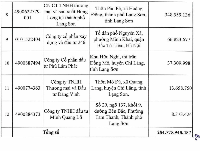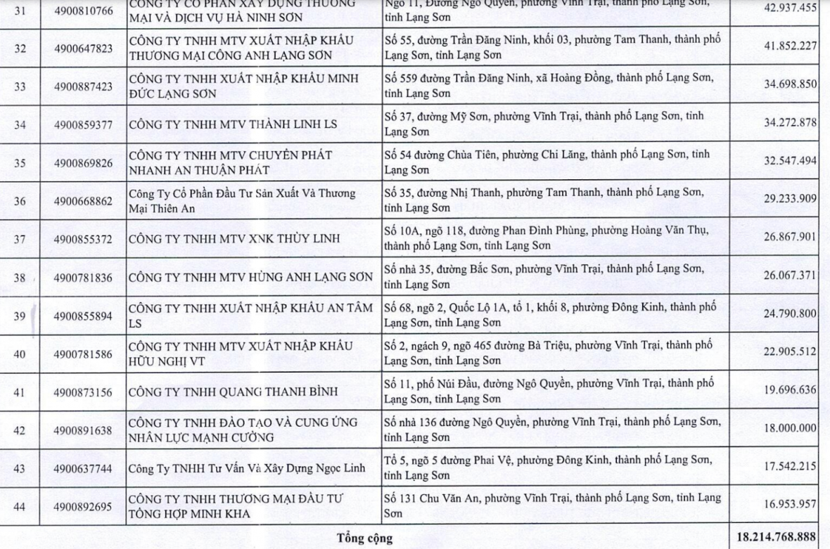Tiếp đến là Công ty TNHH MTV NQ Song Cường Việt Nam (địa chỉ Số nhà 6, ngõ 2, thôn Hoàng thượng, xã Hoàng Đồng, TP Lạng Sơn) số tiền hơn 2 tỷ đồng.