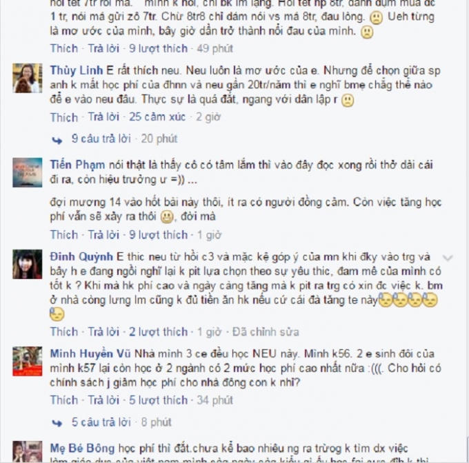 - "Nhà mình nghèo lắm, khi biết được tin này, mình đã chạy vào nhà vệ sinh và khóc nức nở. Bố mẹ ở nhà vẫn đang đầu tắt mặt tối chạy công trình, mình thì đi làm thêm từ sáng đến tôi vẫn không thể trả nổi đc tiền học phí 1 kỳ. Nếu nhà trường không giải thích 1 cách thuyết phục. Mình sẽ THÔI HỌC".