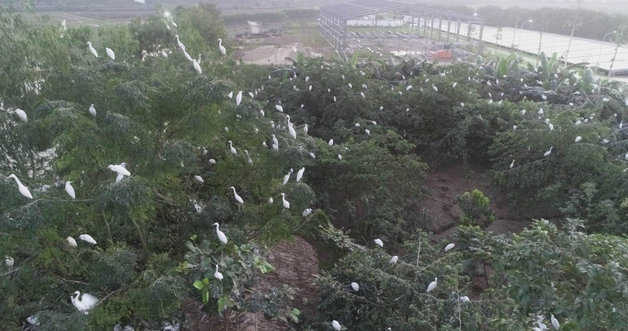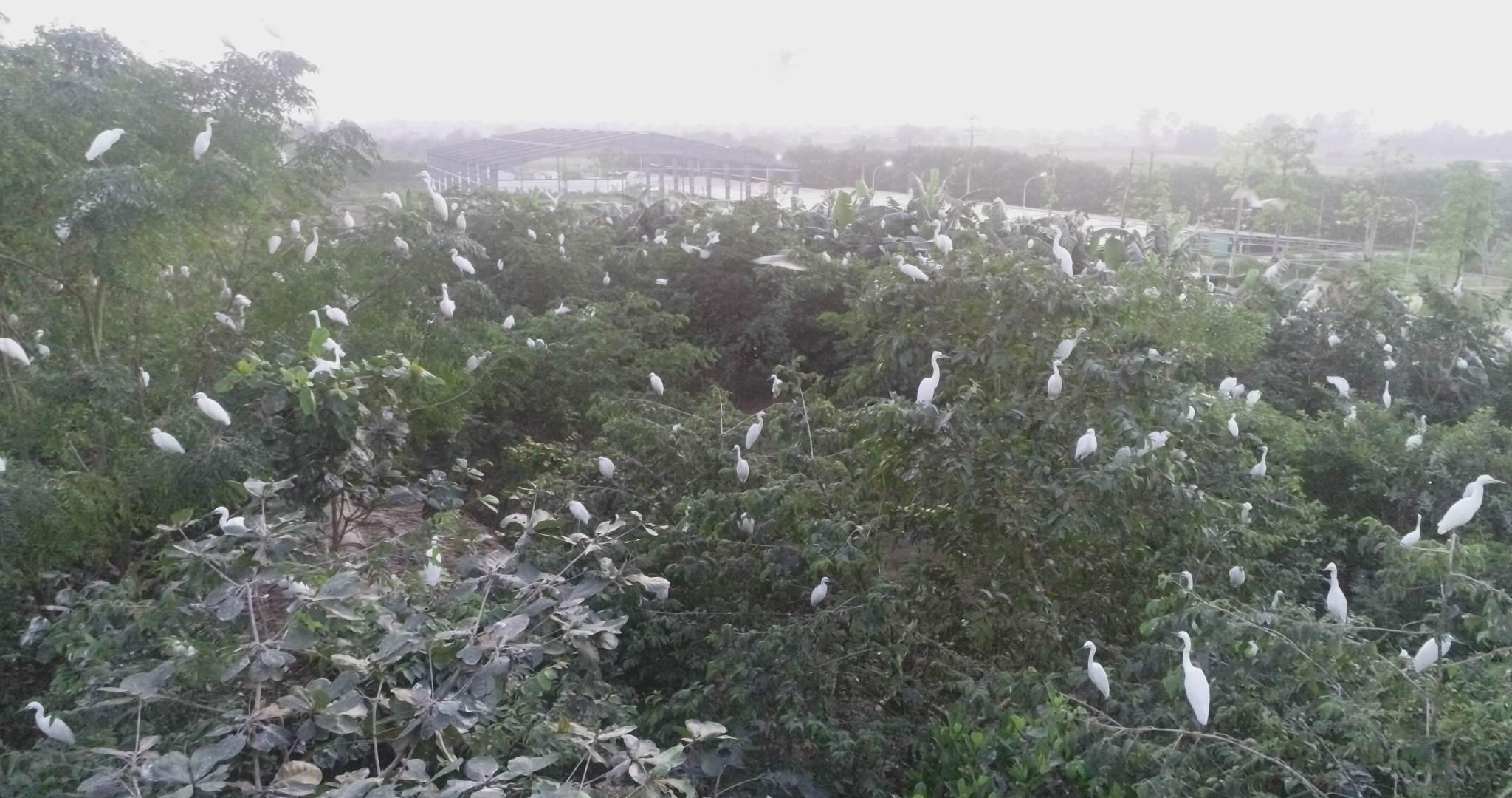 Một đàn cò số lượng lên đến hàng nghìn con bay về làm tổ, sinh nở trên một hòn đảo nhân tạo của một doanh nghiệp trên địa bàn huyện Hưng Nguyên.