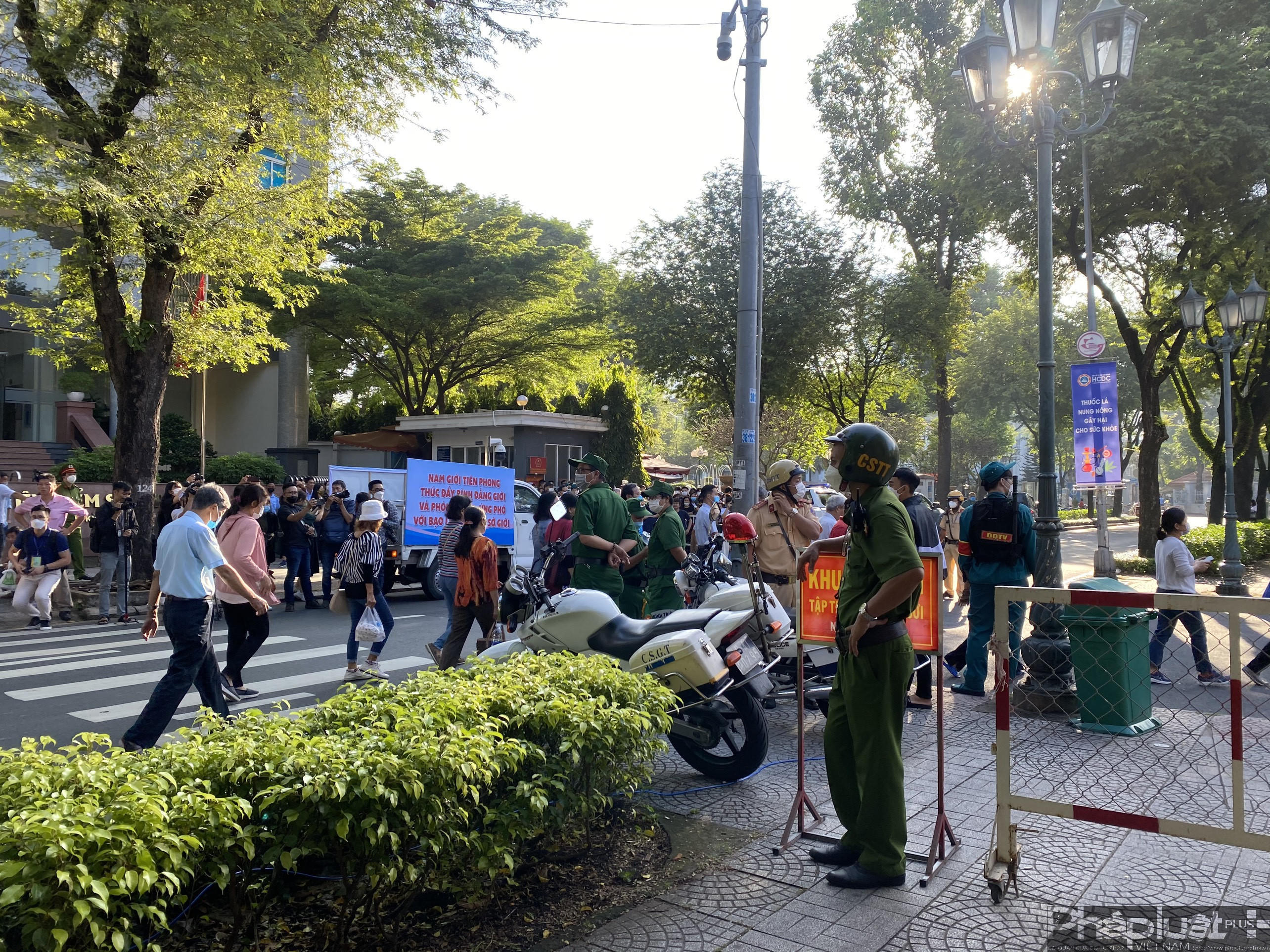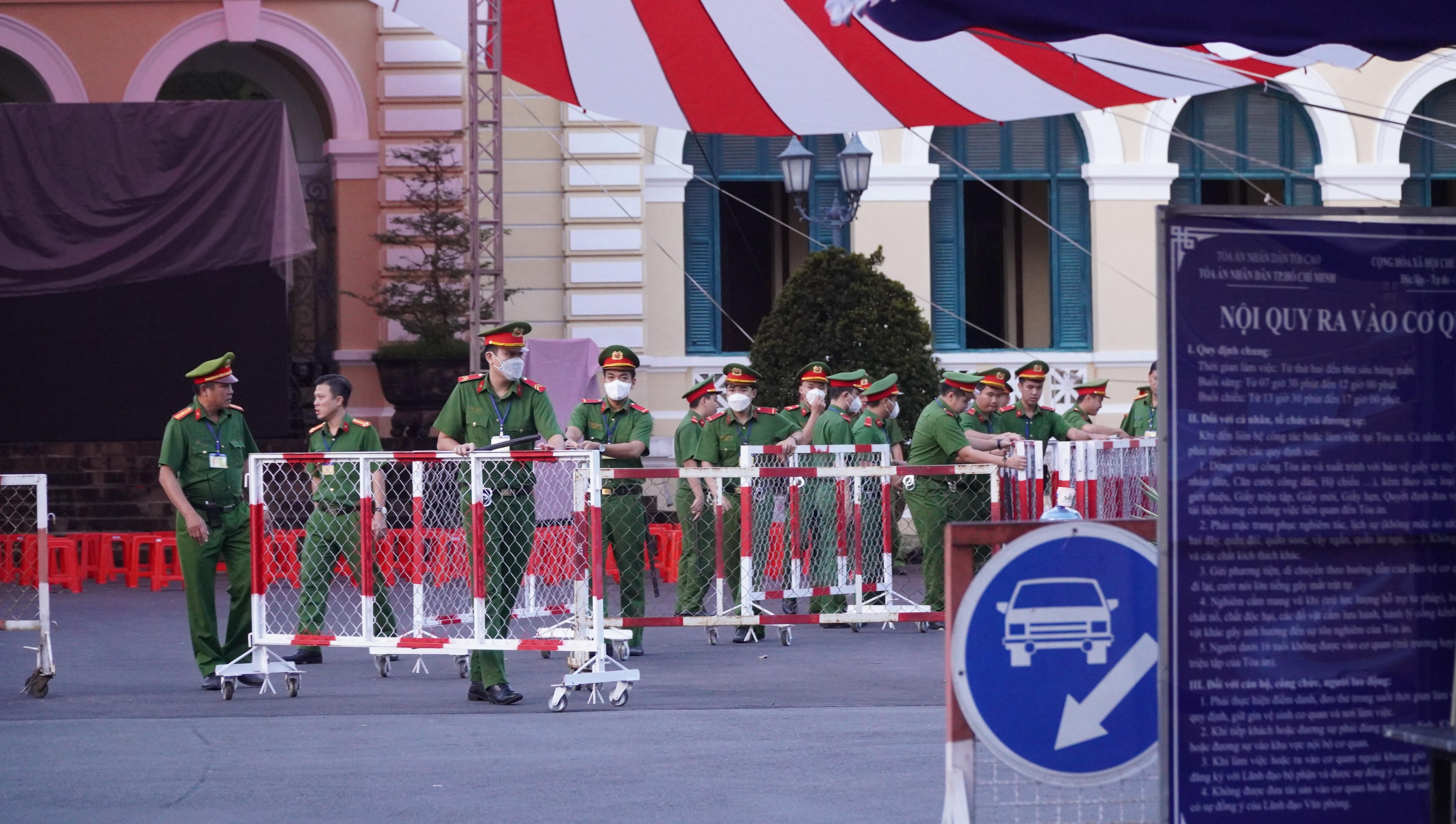 Bên ngoài, rất đông người dân đứng xem, an ninh cũng được siết chặt