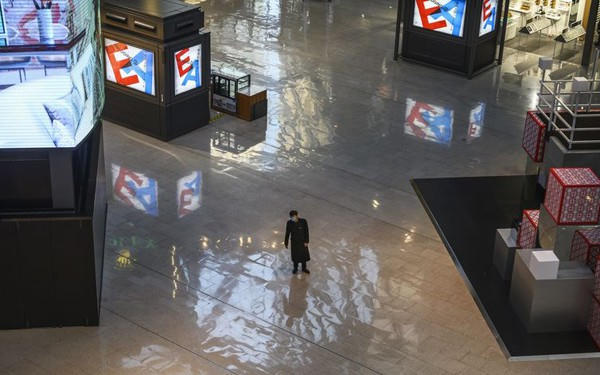 Nhân viên bảo vệ đứng trong một trung tâm thương mại vắng bóng người ở Bắc Kinh hôm 22/2/2020. (Ảnh: Getty Images)