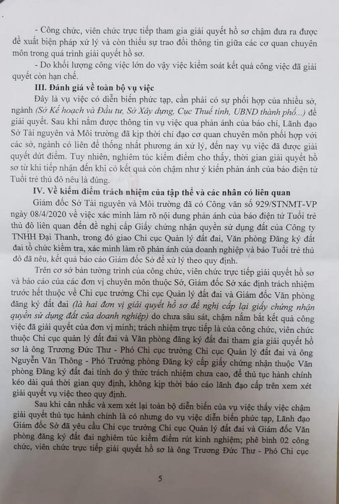 Trước những vi phạm nêu trên, ngày 12/6/2020, Sở TN&MT ban hành văn bản số 1724/STNMT-VP gửi Sở Nội vụ về việc kiểm điểm trách nhiệm.