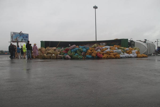 Thời điểm xe bị lật vào khoảng 17h, trời mưa khiến đường rất trơn. Xe Container BKS 63C - 08888 chở 30 tấn dừa đựng trong hộp giấy và bao tải. Toàn bộ số dừa trên thùng container đổ tung tóe giữa đường.