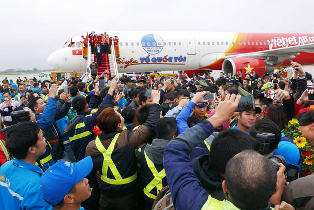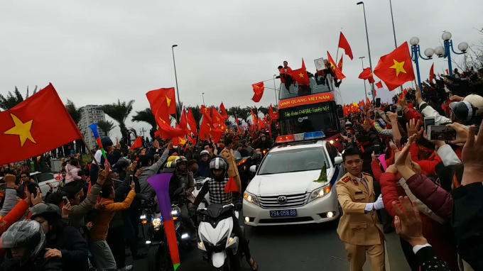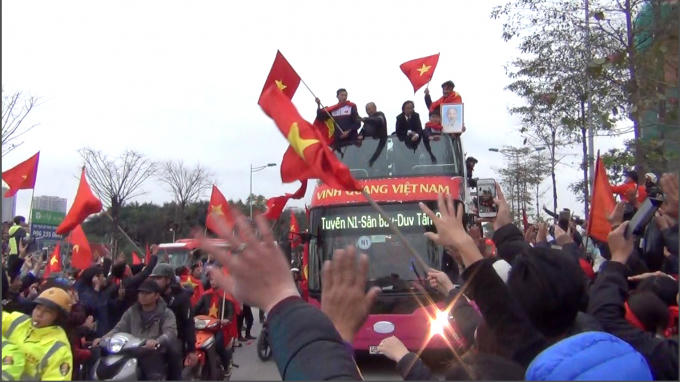 Chiếc xe buýt chở đội tuyển U23 Việt Nam di chuyển từ sân bay Nội Bài về Văn phòng Chính phủ giữa rừng cờ đỏ sao vàng của người hâm mộ.