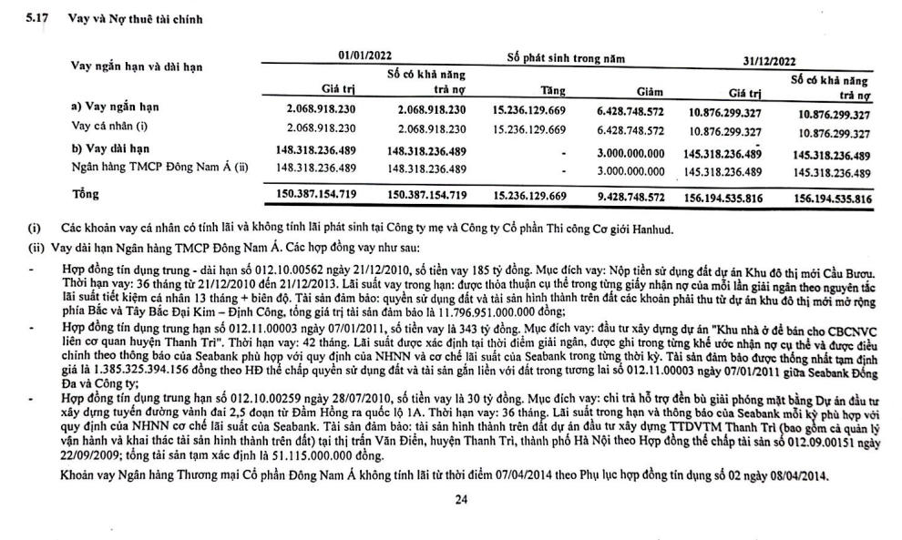 Theo Báo cáo Tài chính hợp nhất 2022, vay ngắn hạn và dài hạn của HANHUD là hơn 150,3 tỷ đồng, trong đó chủ yếu là vay dài hạn (hơn 148,3 tỷ đồng).