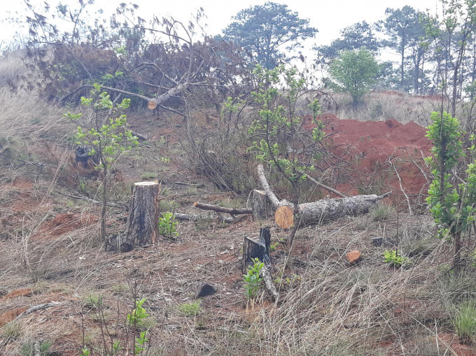 Cụ thể, khi đi đến địa phận xã Nâm N’Jang, chúng tôi phát hiện vụ phá rừng mới nhất, nằm sát quốc lộ 14, khoảng 11 gốc Thông, có đường kính từ 30 đến 50 cm đã bị đốn hạ. Những gốc thông còn rõ vết cưa, cành nhánh đang còn văng vãi khắp cả khu vực. Không những thế, bên trong có có dấu hiệu lấn chiếm đất lâm nghiệp để làm nhà ở tạm, hàng quán hay san lấp mặt bằng.