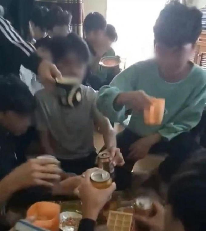 Nhiều em học sinh cầm lon bia chúc tụng nhau. (Ảnh: Cắt từ clip)