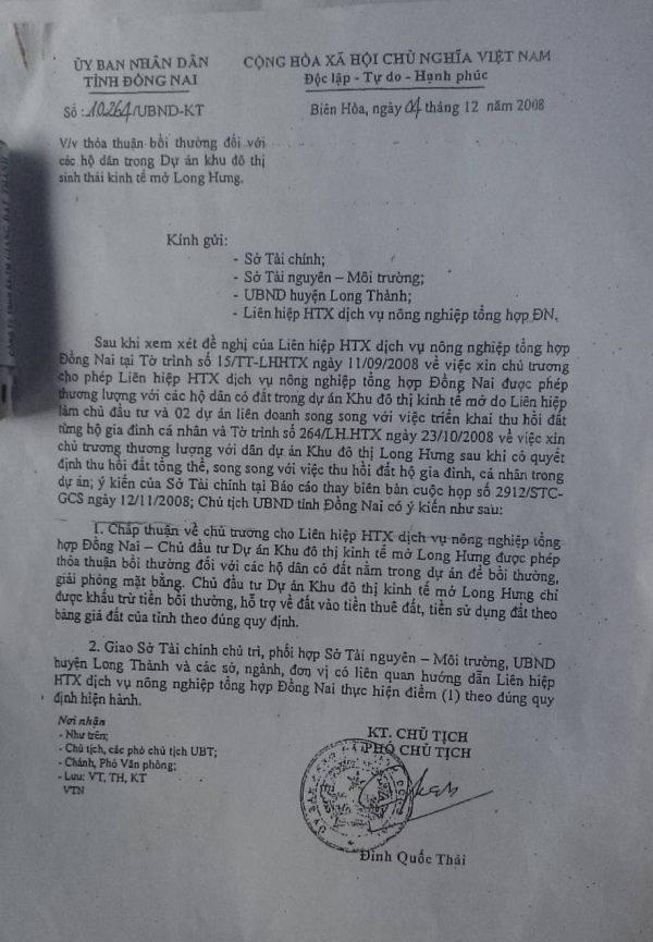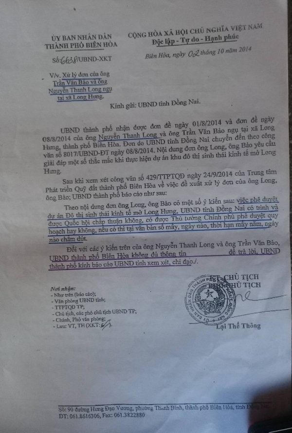 Tiếp đó, ngày 2/10/2014, UBND TP.Biên Hòa có văn bản số 6638 gửi UBND tỉnh Đồng Nai về việc “Xử lý đơn của ông Trần Văn Bảo và ông Nguyễn Thành Long”. Nội dung văn bản có ghi: “Ông Long, ông Bảo có một số ý kiến sau: Việc phê duyệt dự án Khu đô thị kinh tế mở Long Hưng, UBND tỉnh Đồng Nai có trình và được Quốc hội chấp thuận không, có được Thủ tướng Chính phủ phê duyệt quy hoạch hay không, nếu có thì văn bản số mấy, ngày nào, thời hạn mấy năm, ngày nào chấm dứt… UBND TP. Biên Hòa không đủ thông tin để trả lời, kính báo UBND tỉnh xem xét, chỉ đạo.”