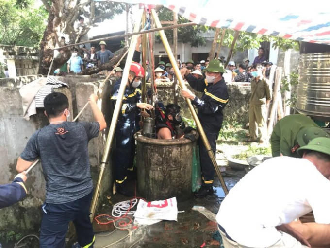 Lực lượng cứu nạn cứu hộ đã sử dụng bình lọc khí di chuyển xuống dưới giếng để đưa 2 cha con ra ngoài. Sau gần 1 giờ tiếp cận hiện trường, lần lượt thi thể 2 nạn nhân đã được đưa lên.