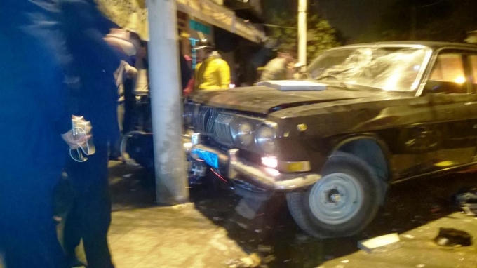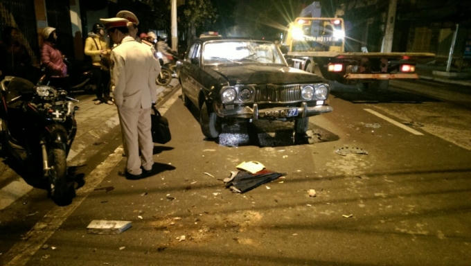 Sau khi gây tai nạn, xe con này bỏ chạy và gây tiếp 3 vụ tông xe và người đi bộ. Xe chỉ dừng lại khi tông lên vỉa hè đâm vào cột điện trước nhà dân.