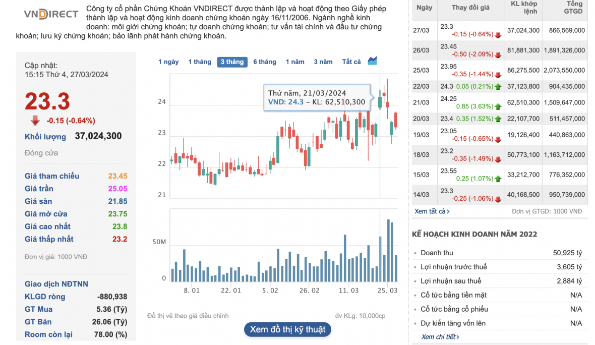 Đóng cửa phiên chứng khoán 27/3/2024, cổ phiếu VND giảm còn 23.300 đồng/cổ phiếu, tương ứng mức giảm 4,12% so với ngày 22/3 (giá 24.300 đồng/CP) - phiên giao dịch ngay trước thời điểm hệ thống bị tấn công.