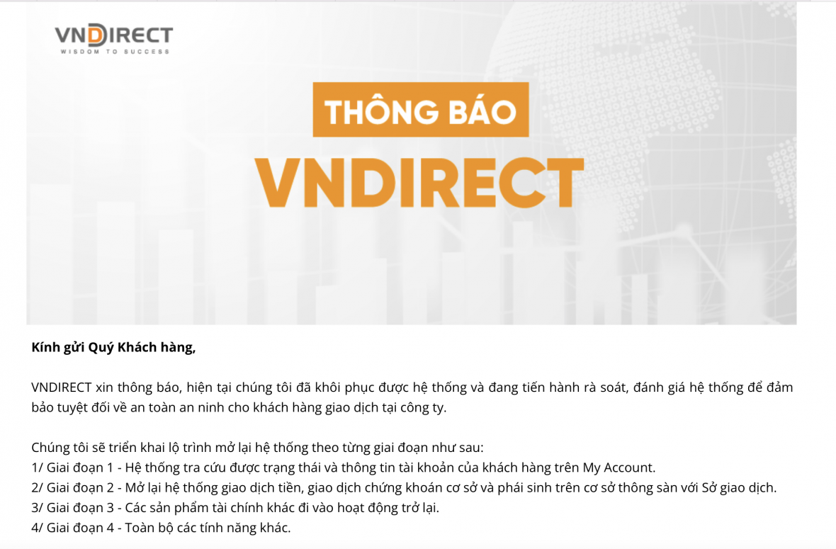 Theo VNDirect, hiện hệ thống đã hoàn thành giai đoạn 1. Do hệ thống mới vừa được khôi phục và có thể có lượng lớn khách hàng truy cập, nếu có lỗi xảy ra, khách hàng nên chờ đợi và tải lại trang vào thời gian khác.