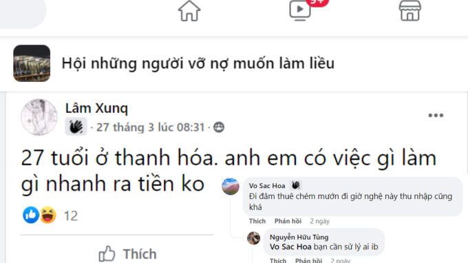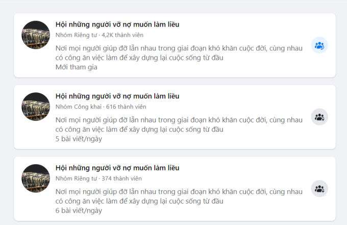 Nhóm “Hội những người vỡ nợ muốn làm liều” đến nay đã quy tụ hơn 4.100 thành viên, chủ yếu là các thành phần ăn chơi lêu lổng, không có công việc cụ thể, nợ nần do cờ bạc, cá độ. Nhóm này thường xuyên đăng những bài viết với nội dung trốn nợ, tụ tập đánh nhau, hay rủ nhau đi trộm, cướp.