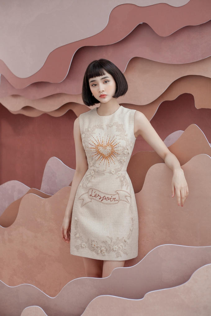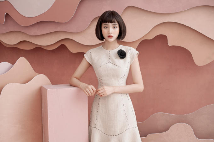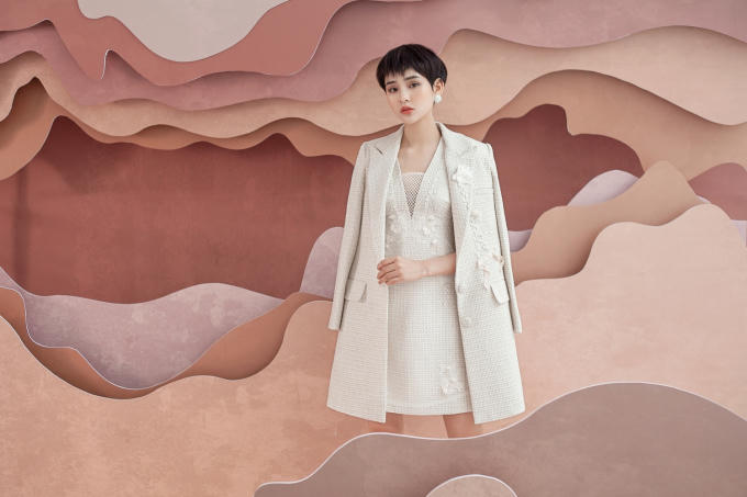 Bộ 1 - Ca sỉ HIền Hồ chọn chiếc đầm cocktail màu trắng tinh khôi bằng chết liệu vải tweed. Đây là loại vải có bề mặt sần, chống ẩm ướt và giữ ấm tốt, do đó thích hợp với những ngày chuyển mùa cuối năm. Vải tweed từng trở thành chất liệu thời trang cao cấp dành cho giới thượng lưu nhờ sự lăng xê của nhà thiết kế Coco Chanel từ những năm 1920.