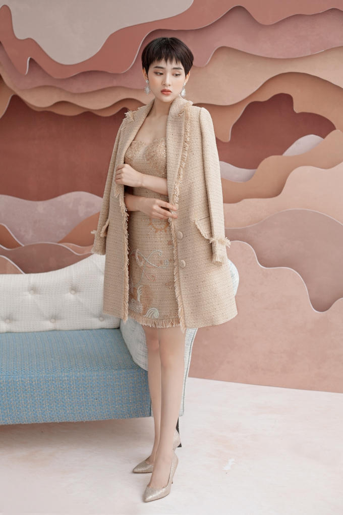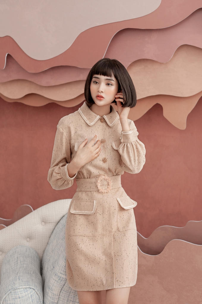 Bộ 2 - Hiền Hồ gợi ý một thiết kế kín đáo với gam màu be nhã nhặn, phù hợp các chị em công sở. Điểm nhấn nằm ở những chiếc khuy được đính thủ công bằng đá, ngọc trai và phần đai lưng to bản.