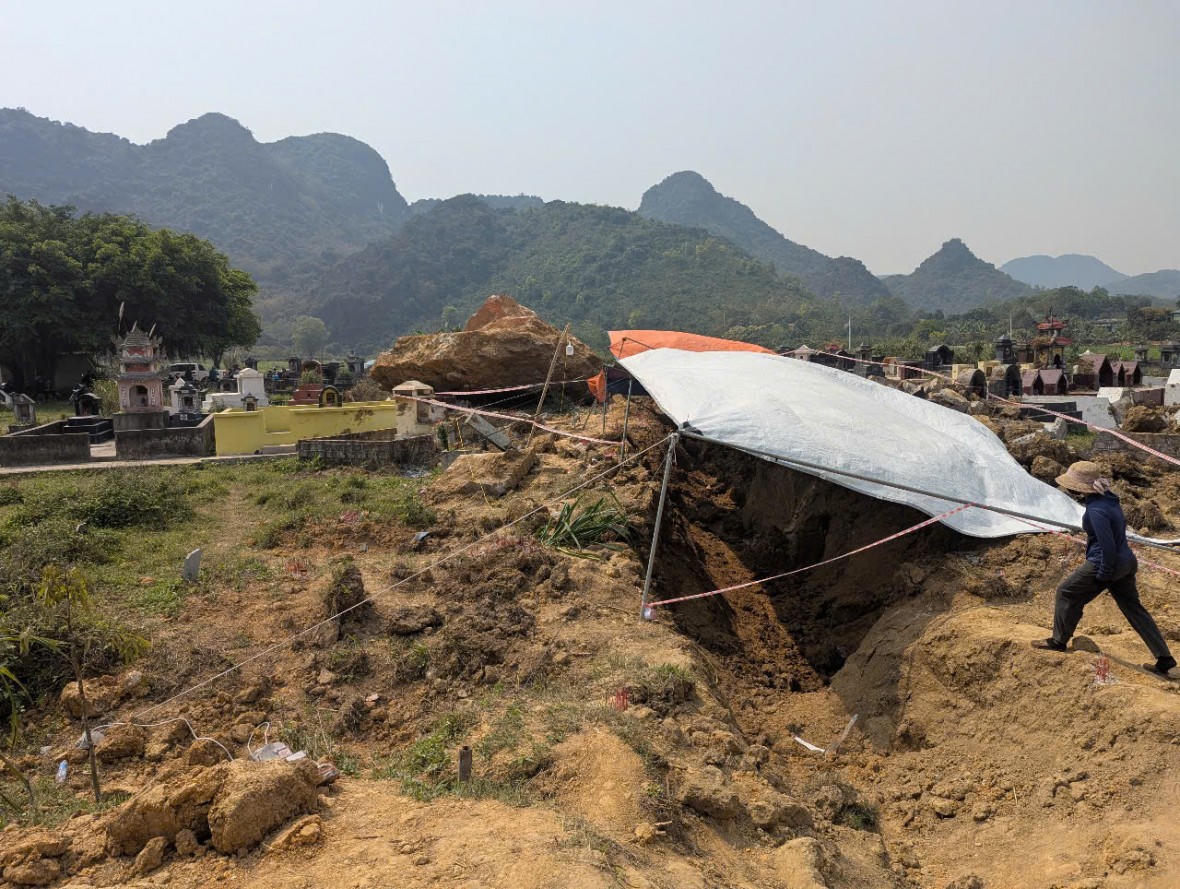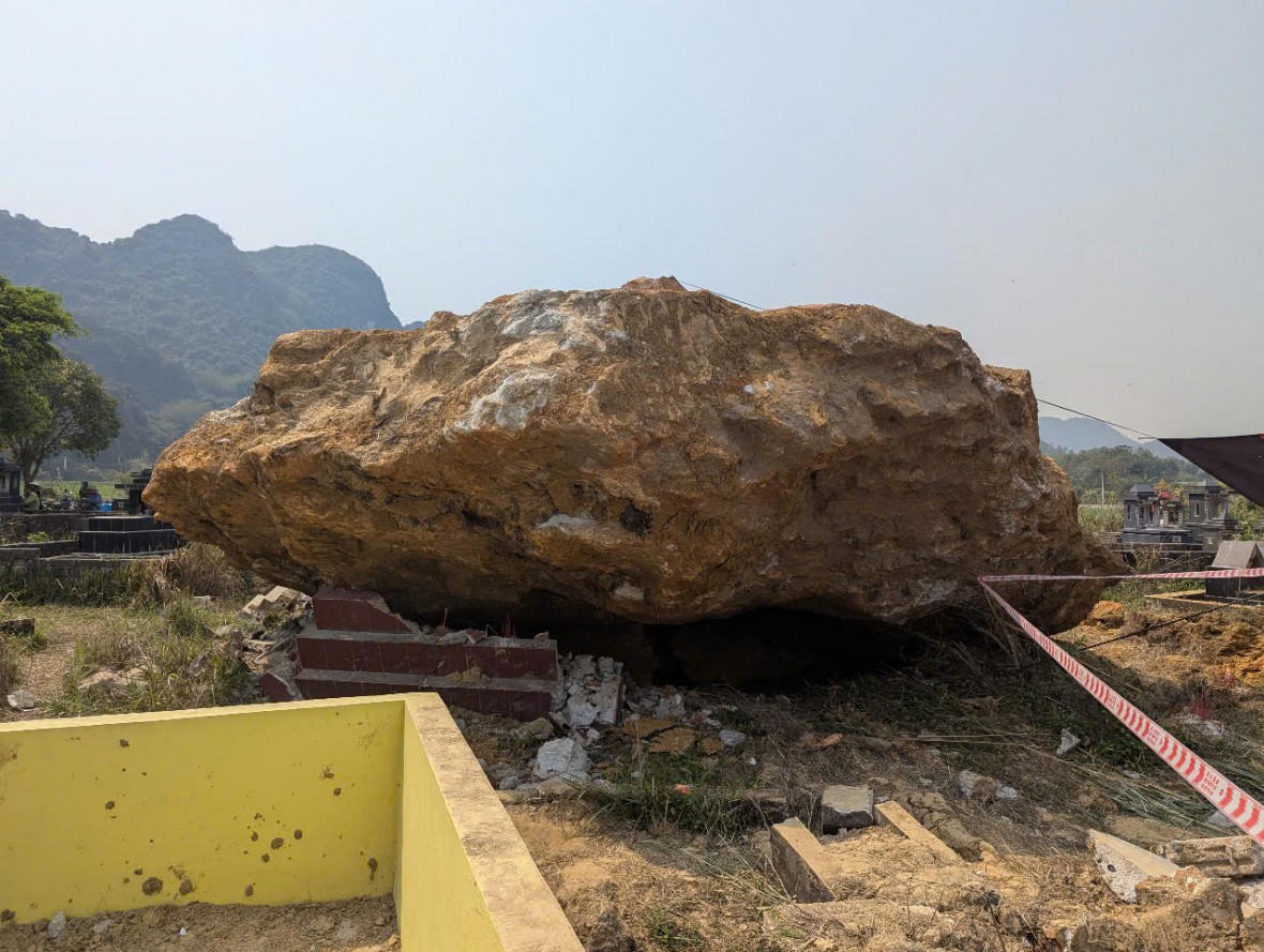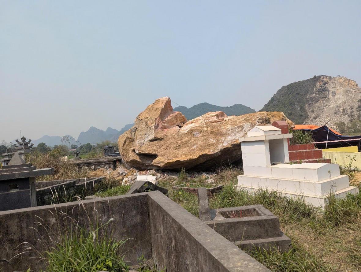 Hàng chục ngôi mộ bị tảng đá lớn va đập làm hư hại sau khi Công ty TNHH Khoáng sản Trang Huy nổ mìn khai thác đá ở thôn Thanh Bồng xã Thanh Nghị, huyện Thanh Liêm, tỉnh Hà Nam.