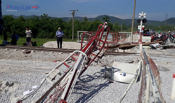 | Barie chắn tàu đã bị húc văng cùng nhiều thiết bị khác hư hỏng. (Ảnh: A.Thắng) |