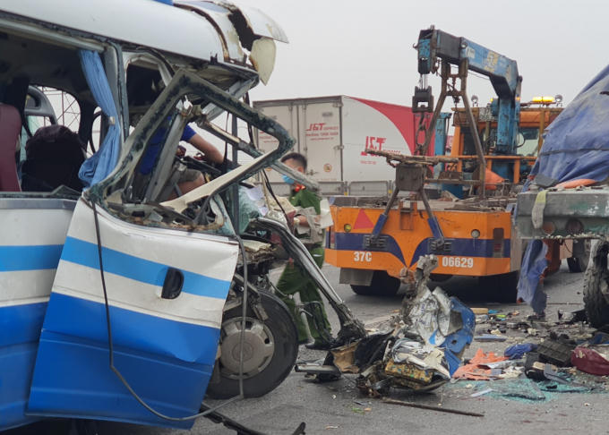 Tại hiện trường, chiếc xe khách nát bét, 1 người tử vong, 21 người khác được đưa vào bệnh viện cấp cứu sau vụ tai nạn.