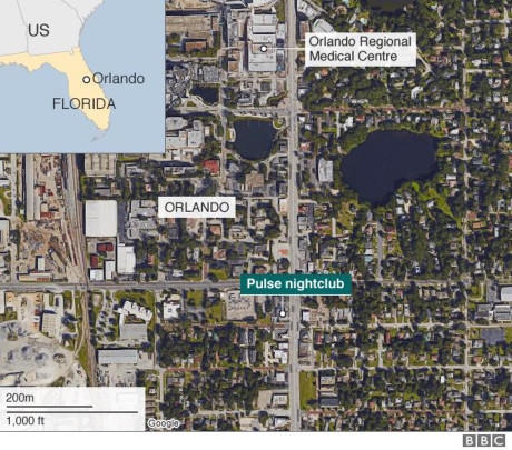 Vị trí hộp đêm Pulse trên bản đồ. Đây là vụ việc gây thương vong thứ hai liên tiếp ở thành phố Orlando trong những ngày vừa qua. Trước đó, nữ ca sĩ Christina Grimmie đã bị bắn chết trong buổi biểu diễn đêm 11/6. Ảnh: BBC