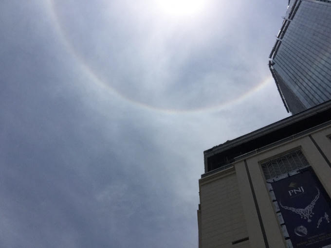 Cụ thể, vầng sáng này được gọi là "quầng Mặt trời". Ban ngày, ánh sáng Mặt trời chiếu qua mây ti tầng (Cirrostratus) ở độ cao 6 - 8km. Do mây này có cấu trúc tinh thể nên ánh sáng bị khúc xạ khiến quầng xuất hiện với đủ sắc màu y hệt cầu vồng ta hay thấy.