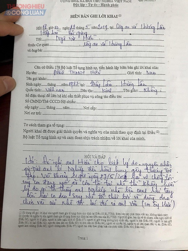 Biên bản ghi lời khai của Công an xã Hương Lâm (Hiệp Hòa, Bắc Giang).