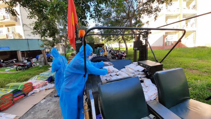 Tất cả thành viên vận chuyển cơm đều được mặc đồ bảo hộ, khử khuẩn, đeo khẩu trang đảm bảo an toàn.