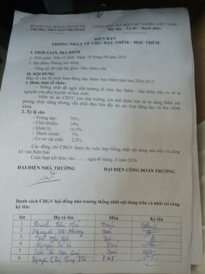 Ngày 28/9/2016, nhà trường đã làm 2 biên bản thống nhất việc dạy thêm, học thêm trên cơ sở tự nguyện của phụ huynh và học sinh.