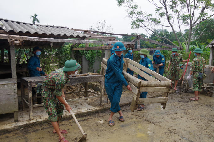 Lũ vừa rút, lực lượng vũ trang tại Nghệ An đã huy động tối đa lực lượng giúp nhân dân vệ sinh môi trường, tiêu độc khử trùng phòng tránh dịch bệnh.