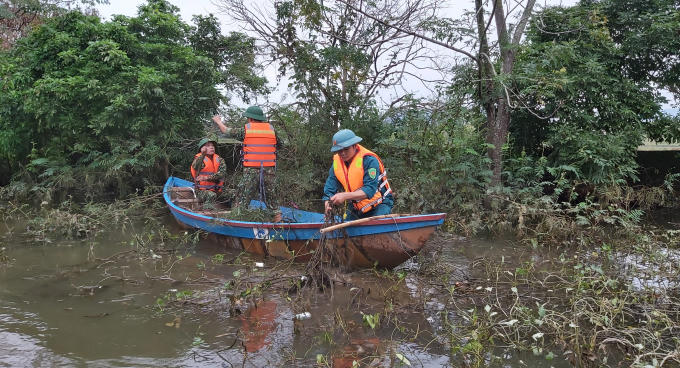 Tại những vị trí nước sâu, lực lượng vũ trang phải dùng thuyền để tiếp cận dọn sạch rác, khơi thông dòng chảy, không để nước tù đọng lâu ngày phát sinh dịch bệnh.