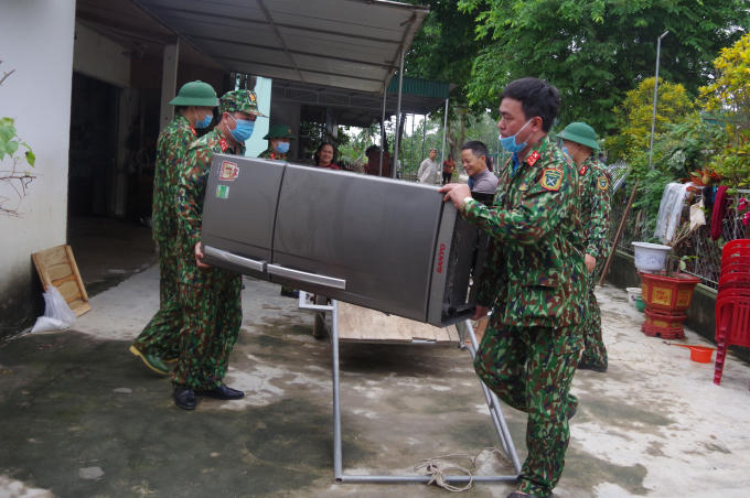 Lực lượng vũ trang giúp những gia đình có hoàn cảnh neo đơn dọn dẹp nhà cửa, bố trí lại đồ dùng, sớm ổn định cuộc sống sau lũ.