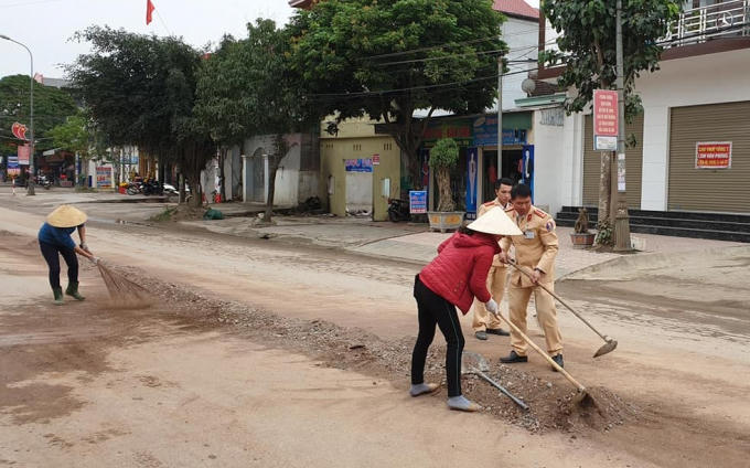 Hình ảnh đẹp, CSGT cùng nhân dân thu gom đất đá đảm bảo an toàn giao thông.