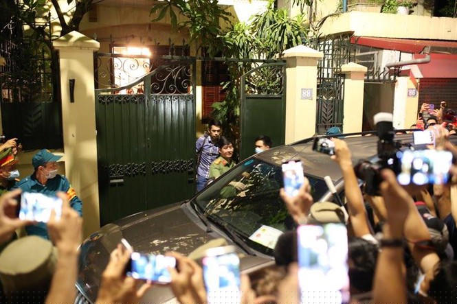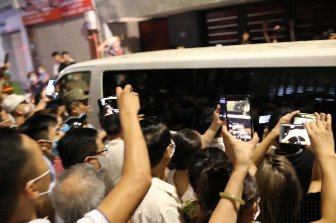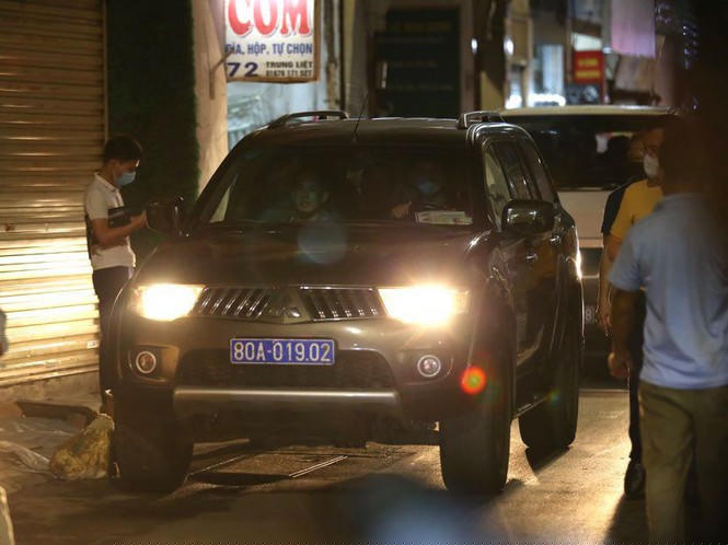 Xe của cơ quan chức năng phải từ từ di chuyển qua dòng người hiếu kỳ để rời khỏi hiện trường. Khoảng 21h27, đoàn xe biển xanh 80A rời khỏi trụ sở UBND TP Hà Nội sau khi thực hiện xong các thủ tục tố tụng