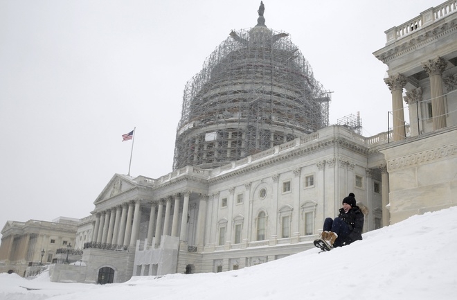 Một người phụ nữ chơi trượt tuyết gần tòa nhà quốc hội Mỹ. (Ảnh: Reuters)