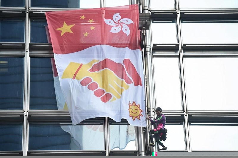 Sáng 16-8, “người nhện" Pháp Alain Robert đã leo lên một tòa nhà chọc trời ở Hong Kong và giương cao "biểu ngữ hòa bình" trong bối cảnh đặc khu này đang hứng chịu các cuộc biểu tình. Ảnh: AFP.