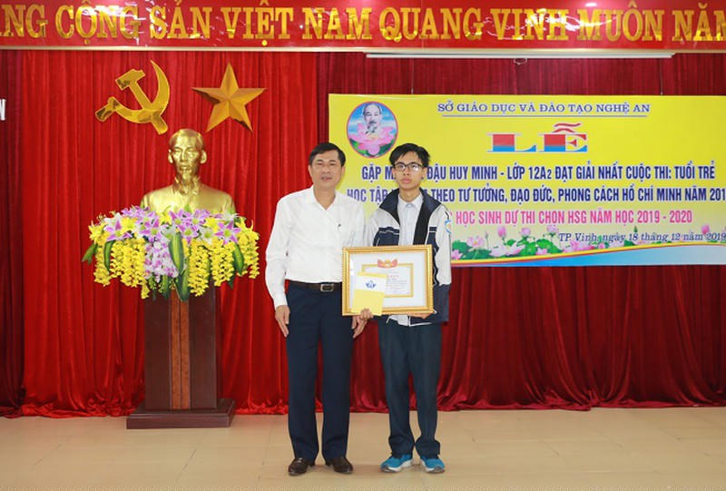 Em Đậu Huy Minh, học sinh lớp 12A2, Trường THPT chuyên Phan Bội Châu (Nghệ An) ngay từ nhỏ đã say mê sưu tầm những câu chuyện kể về thân thế, sự nghiệp của Chủ tịch Hồ Chí Minh và luôn ý thức, học tập Bác để trở thành học sinh giỏi toàn diện, sống có trách nhiệm với cộng đồng. Tại cuộc thi năm 2019, em Đậu Huy Minh xuất sắc vượt qua 500 nghìn thí sinh toàn quốc tham dự, giành giải Nhất khối học sinh, làm nức lòng bao học sinh xứ Nghệ.