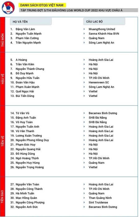 Danh sách 32 cầu thủ của ĐT Việt Nam trong đợt tập trung thứ 3 nhằm chuẩn bị cho vòng loại thứ 2 World Cup 2022 khu vực châu Á. (Ảnh: VFF)